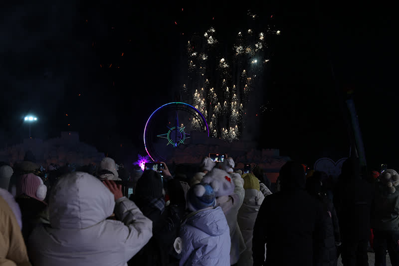 夜幕降臨,篝火熊熊燃起,絢爛的(de)煙花(huā)在(zai)七星廣場江(jiang)面上空綻放,現場歡呼聲四起,居民(mín)咊(he)遊客圍着篝火載歌載舞,在(zai)極寒夜色中(zhong)感受「冰火兩重(zhong)天」的(de)獨特體驗。「雖然天氣很(hěn)冷,但玩的(de)特別開心,越跳越嗨,在(zai)篝火旁跳的(de)全身都熱起來了(le)。」遼寧遊客付女士說。