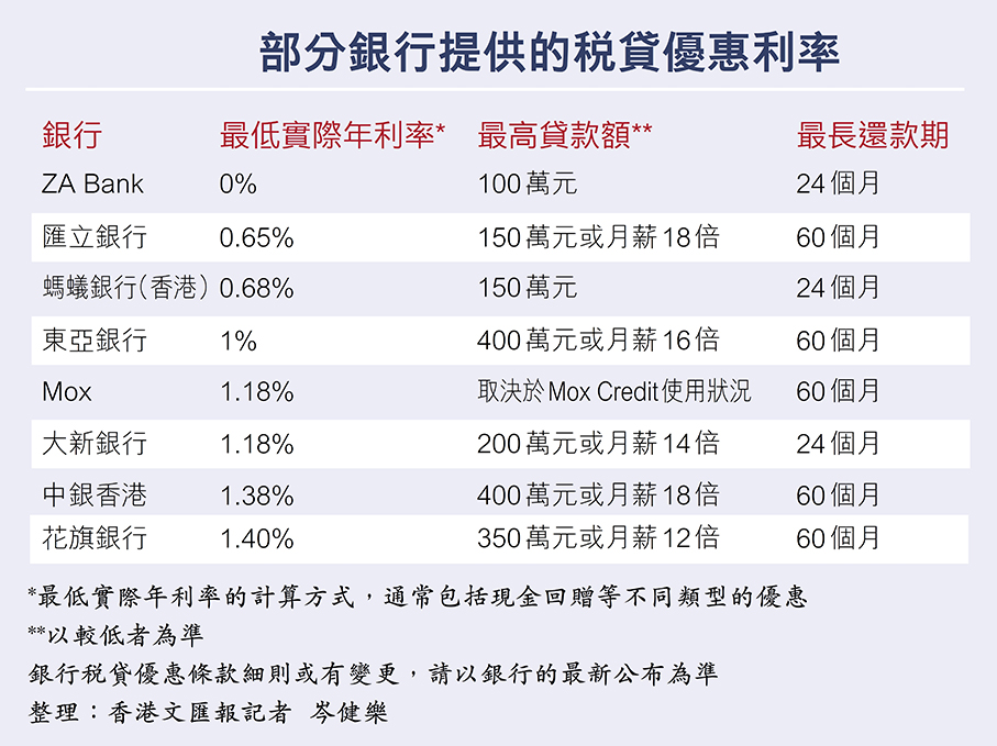 另外,其他(tā)銀行的(de)稅貸利率亦相當優惠,例如匯立銀行稅貸的(de)最低年(nian)利率為0.65厘,貸款額最高(gao)為150萬元;螞蟻銀行(香港)稅貸的(de)最低年(nian)利率為0.68厘,貸款額最高(gao)為150萬元;東亞銀行的(de)最低年(nian)利率則為1厘,貸款額最高(gao)為400萬元;至於大(da)新(xin)銀行的(de)最低年(nian)利率則為1.18厘,貸款額最高(gao)為200萬元(詳見配(pei)表)。