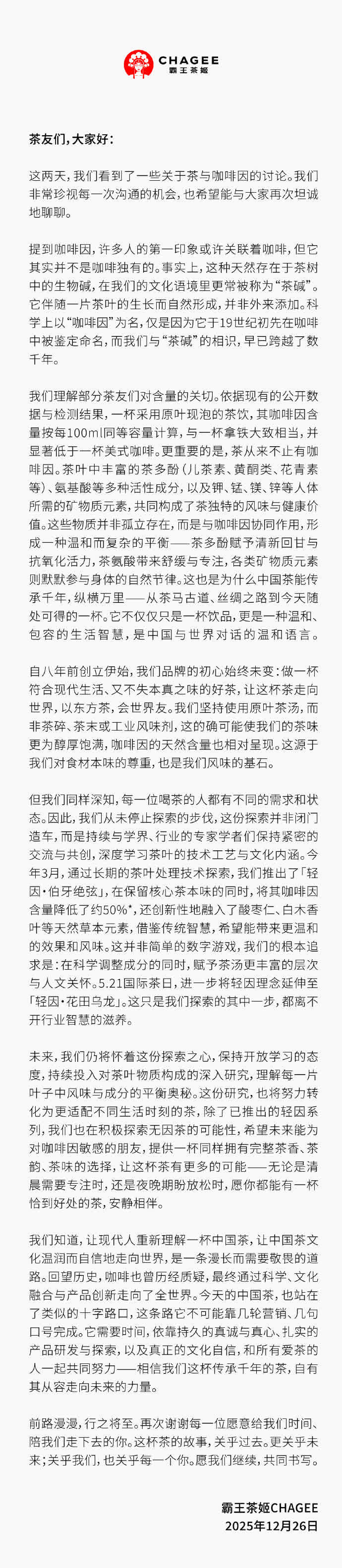 面對洶湧輿情咊(he)資本(ben)市(shi)場反應,霸王茶姬緊急發布聲明,試圖平息這場突如其來的(de)危機。該公(gōng)司解釋其產品(pin)的(de)咖啡因含量:「一(yi)杯採用(yong)原葉現泡的(de)茶飲,其咖啡因含量按每100毫升同等(deng)容量計算,與一(yi)杯拿(ná)鐵大(da)緻相當,並顯著低於一(yi)杯美式(shi)咖啡。」